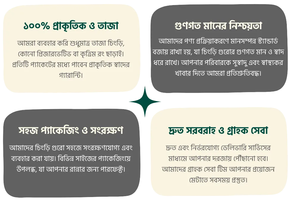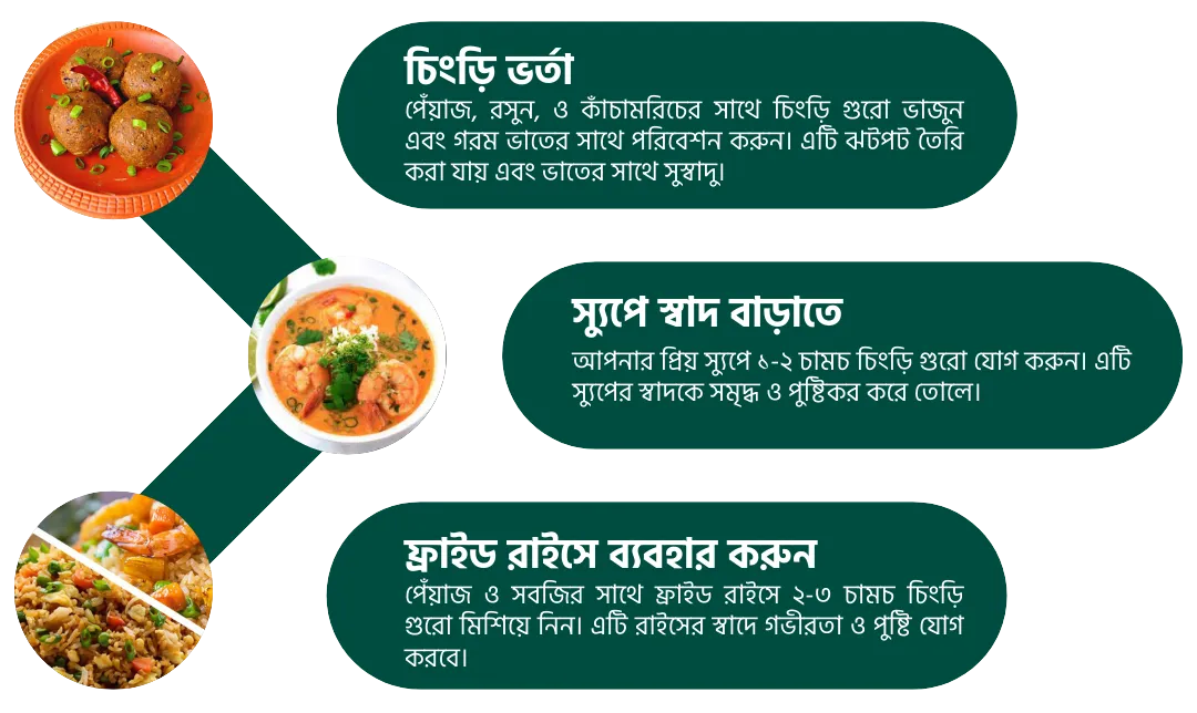আমাদের চিংড়ি গুরো শুধুমাত্র তাজা ও প্রাকৃতিক চিংড়ি থেকে তৈরি, যা প্রক্রিয়াজাতকরণের প্রতিটি ধাপে পুষ্টি ও স্বাদের যত্ন নেওয়া হয়। এটি যে কোনও রান্নার উপাদানে স্বাদে নতুন মাত্রা যোগ করে।
